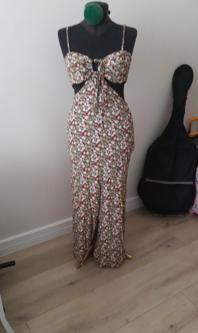 Çiçek desenli, straplez yakalı, drapeli ve vücuda oturan bohem uzun elbise. Yumuşak sentetik kumaştan, gündüz romantik akşamlar için uygun. marka tam hatırlamıyorum ama ya bershka pullbear olması lazım rahatsız ettiği için kesmiştim etiketi. S ,M beden giyer sırt lastikli ben M bedenbedenim bana oluyor