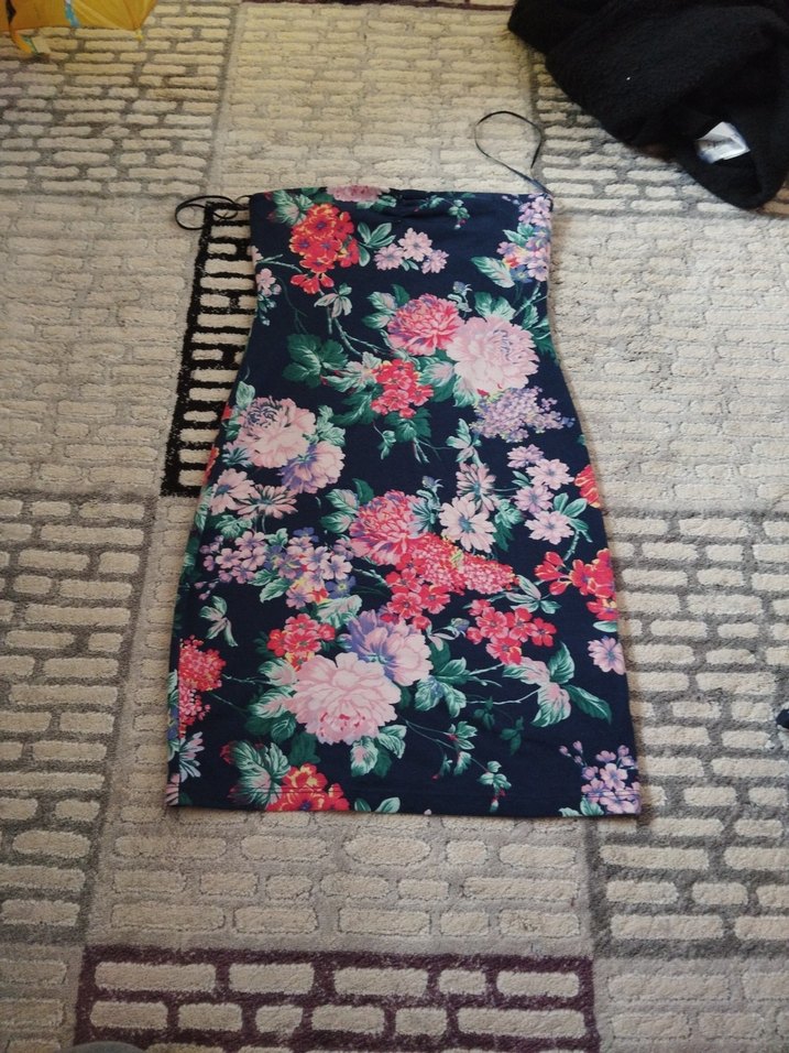 Bu straplez, kısa kalem elbise koyu çok renkli çiçek deseni ve fermuarlı sırt detayıyla bohem tarzda, romantik akşamlar için uygun.
