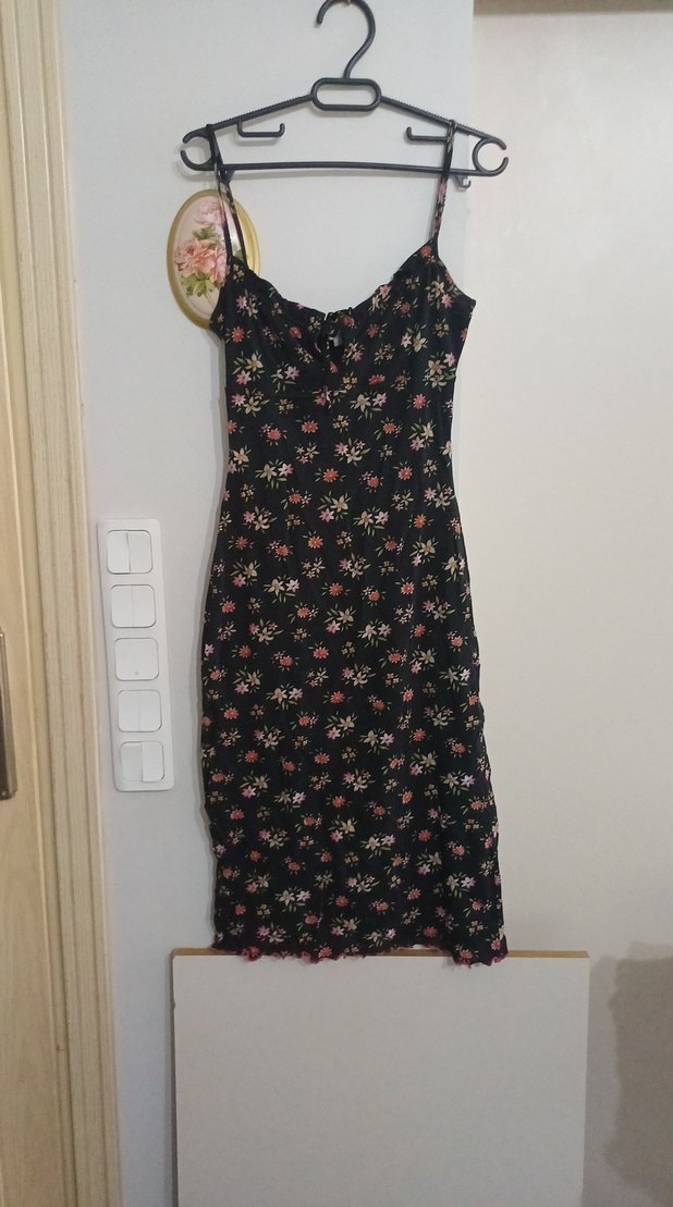 İnce askılı, çiçek desenli ve dantel detaylı bu fitted midi elbise, romantik bir akşam için bohem ve vintage tarzı yansıtıyor.