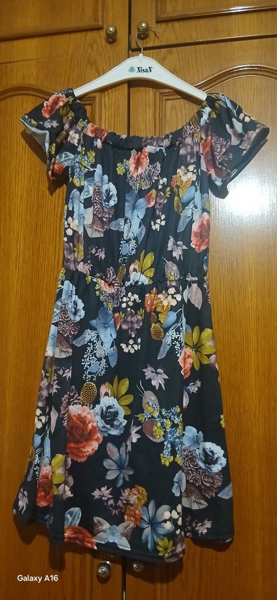 Bohem tarzı, straplez yaka ve kısa kollu, volan detaylı midi elbise. Rahat kesim, canlı çiçek desenli ve yumuşak sentetik kumaştan.