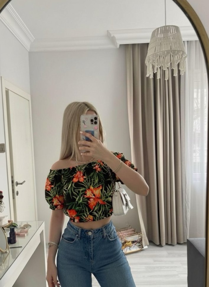 Çiçek desenli, straplez ve kısa kollu bu hafif denim bluz, salaş kesimi ve şeffaf dokusuyla trend sokak stilini yansıtıyor.