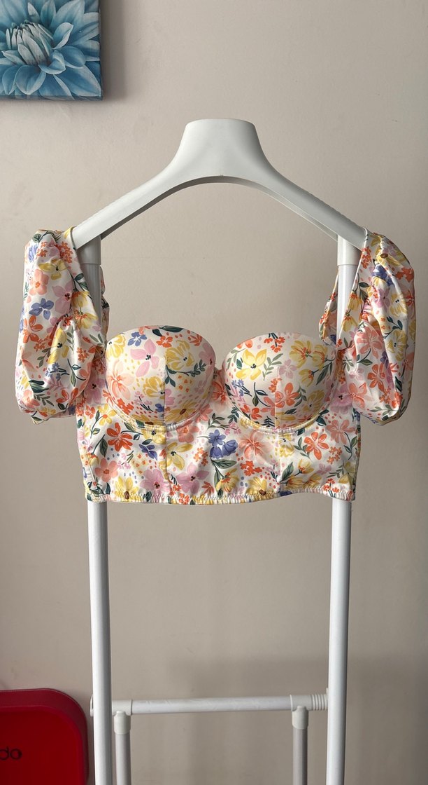 Çiçek desenli, straplez ve askılı kısa mini büstiyer. Yumuşak sentetik kumaştan, dantel detaylı, bohem tarzda dış mekan kullanımı için uygun.