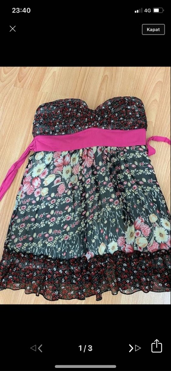 Koyu çiçek desenli, pembe fırfırlı, straplez ve kısa kesim bustiyer elbise. İnce askılı, bohem parti tarzı için uygun.