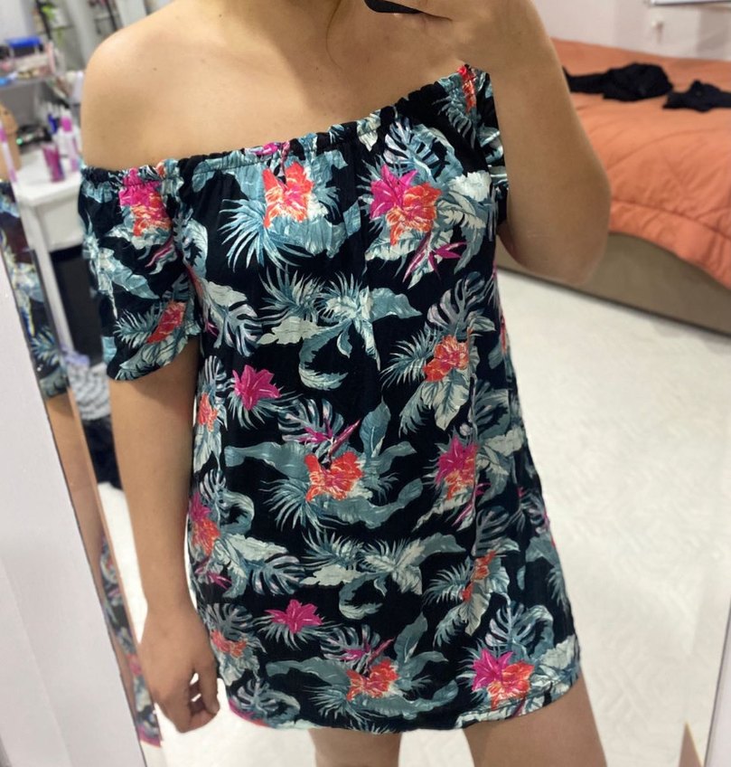 Straplez yakalı, kısa kollu, bol kesim mini elbise. Çok renkli çiçek desenli ve fırfır detaylı, günlük kullanıma uygun bohem tarzda.