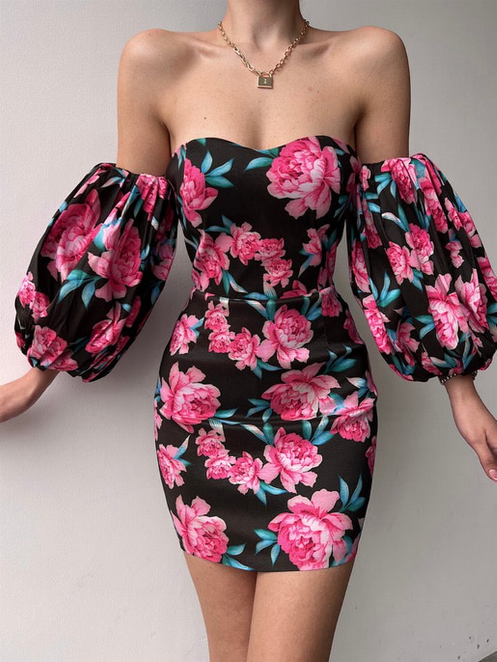 Çiçek Desenli Straplez Mini Elbise