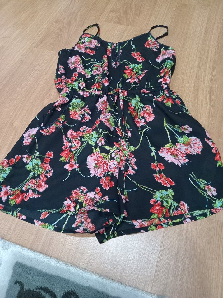 Sentetik kumaştan, çiçek desenli, straplez ve kolsuz, bol kesim mini tulum. Günlük kullanım için bohem tarzda rahat bir parça.