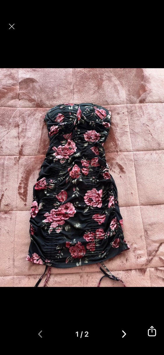 Siyah üzerine koyu pembe çiçek desenli, straplez, drapeli ve vücuda oturan uzun elbise. Romantik akşamlar için uygun.
