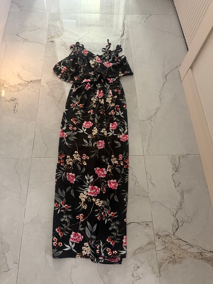 Straplez yaka, çiçek desenli ve fırfır detaylı bohem tarzda, sentetik kumaştan yapılmış, fit kesim uzun elbisedir. Günlük kullanıma uygundur.