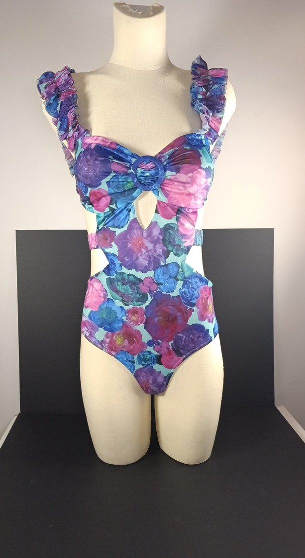 Çiçek desenli, pastel renklerde, strappy kollu ve tokalı, vücuda oturan kadın mayo. Parti için uygundur.