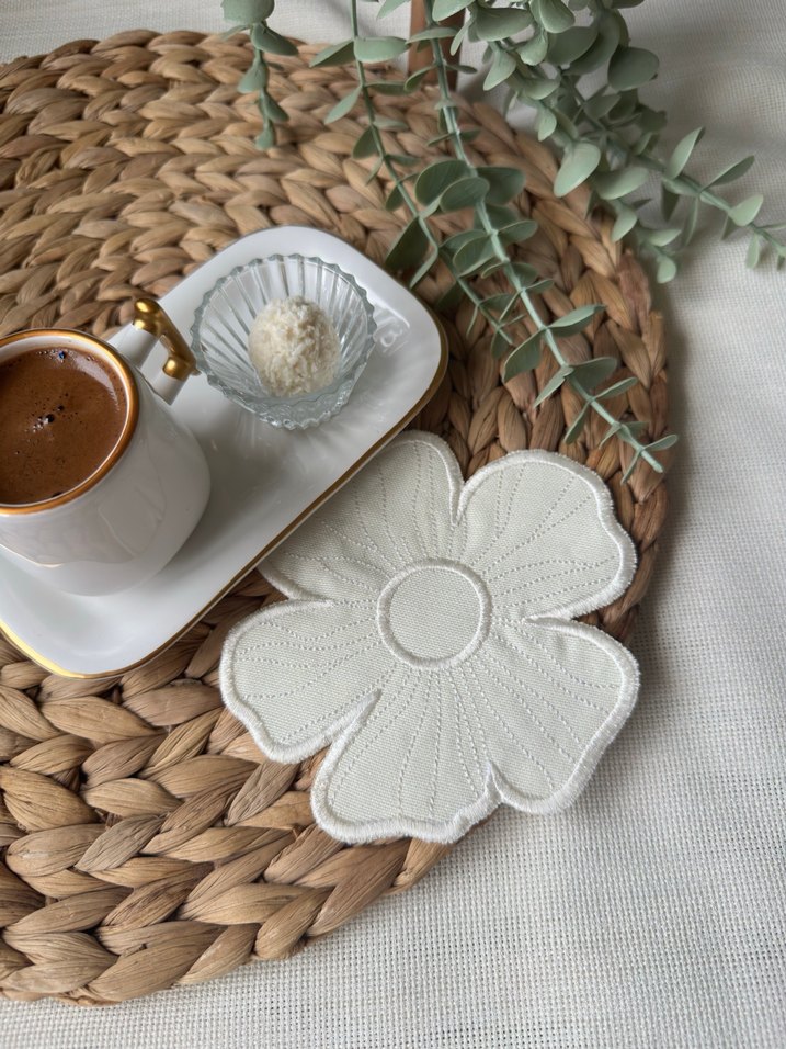 Beyaz çiçek desenli, nakış işleme sunum peçetesi bohem tarzda masanıza doğal bir dokunuş katar.