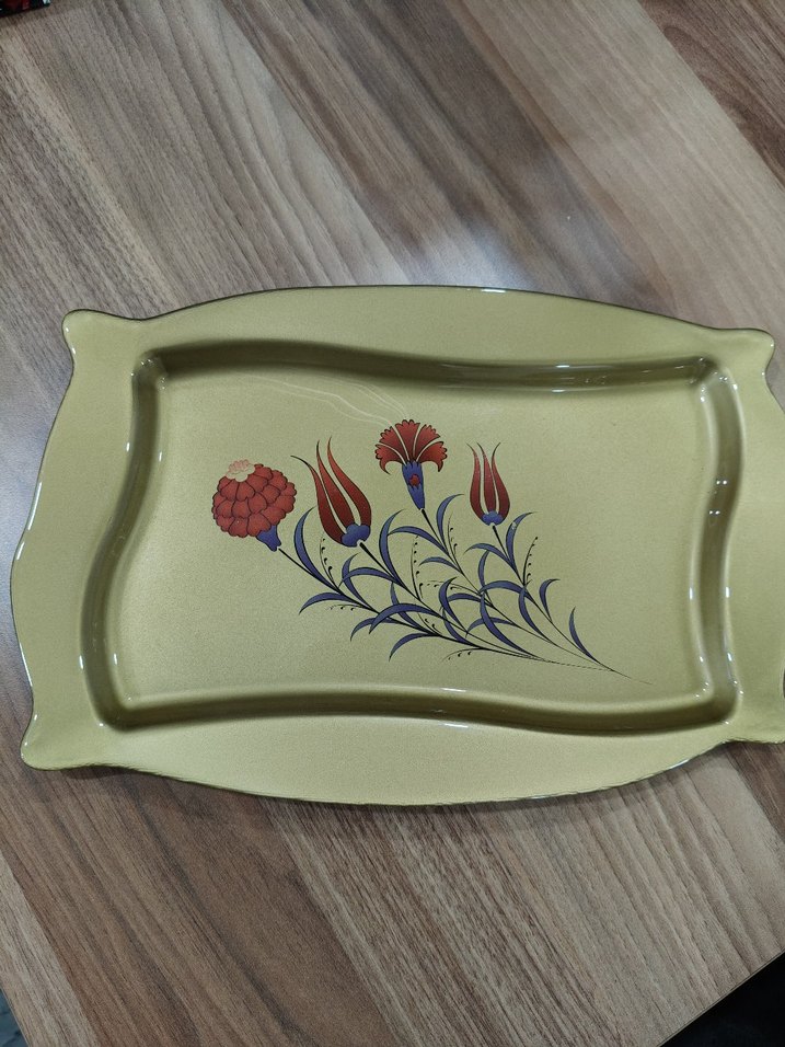 Kahverengi çiçek desenli, klasik tarzda sunum tepsisi. Üzerinde kırmızı ve mavi çiçekler bulunur.