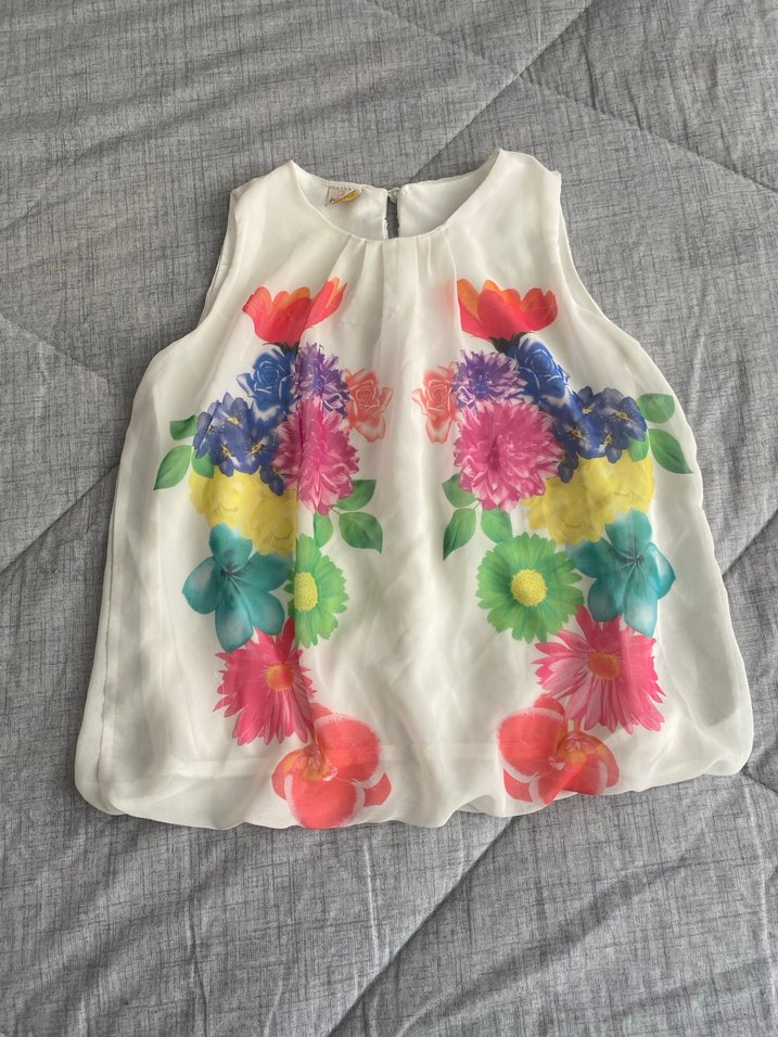 Kolsuz, straplez yakalı, transparan tekstil kumaş üzerine pastel renkli canlı çiçek desenli bol kesim kız bluzu. 8 9 yaş