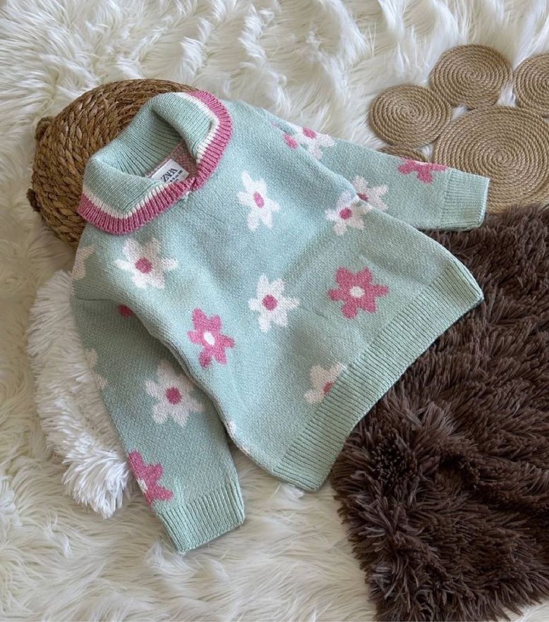 Pastel renkli, çiçek desenli, yakalı uzun kollu kız çocuk kazak. 6-7 yaş 8-9 yaş mevcuttur.