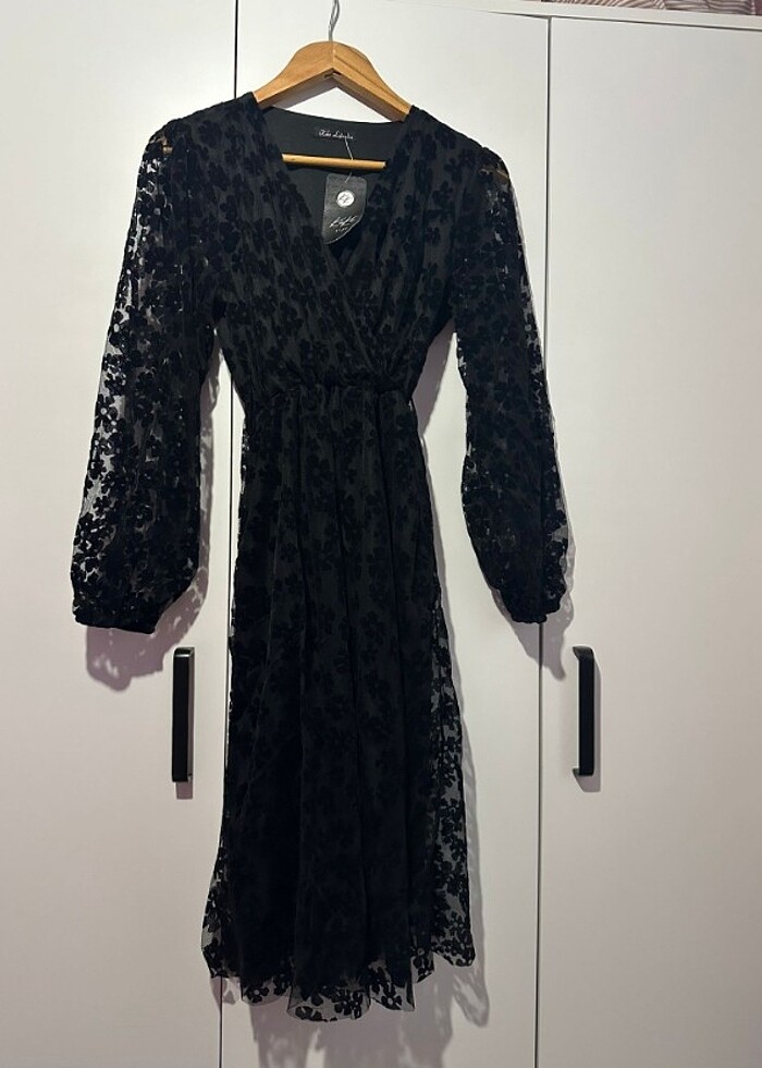 "Siyah tül üzerine işlenmiş zarif çiçek desenleriyle diz üstü elbise. Feminen ve şık, hem günlük hem özel anlar için ideal."