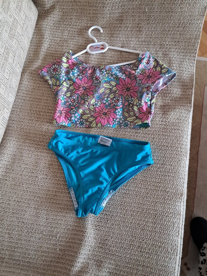 Kısa kollu çiçek desenli üst ve düz turkuaz alt parçadan oluşan renkli kız bikini takımı, plaj için uygundur.