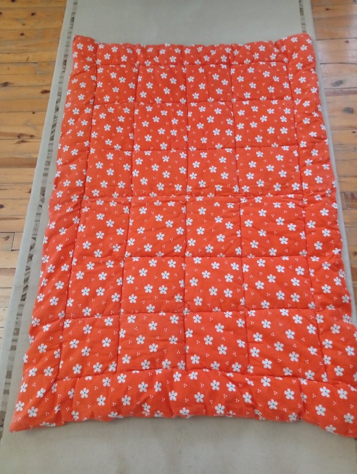Yumuşak sentetik kumaştan yapılmış, turuncu zemin üzerinde beyaz çiçek desenleri bulunan renkli çocuk yorganı