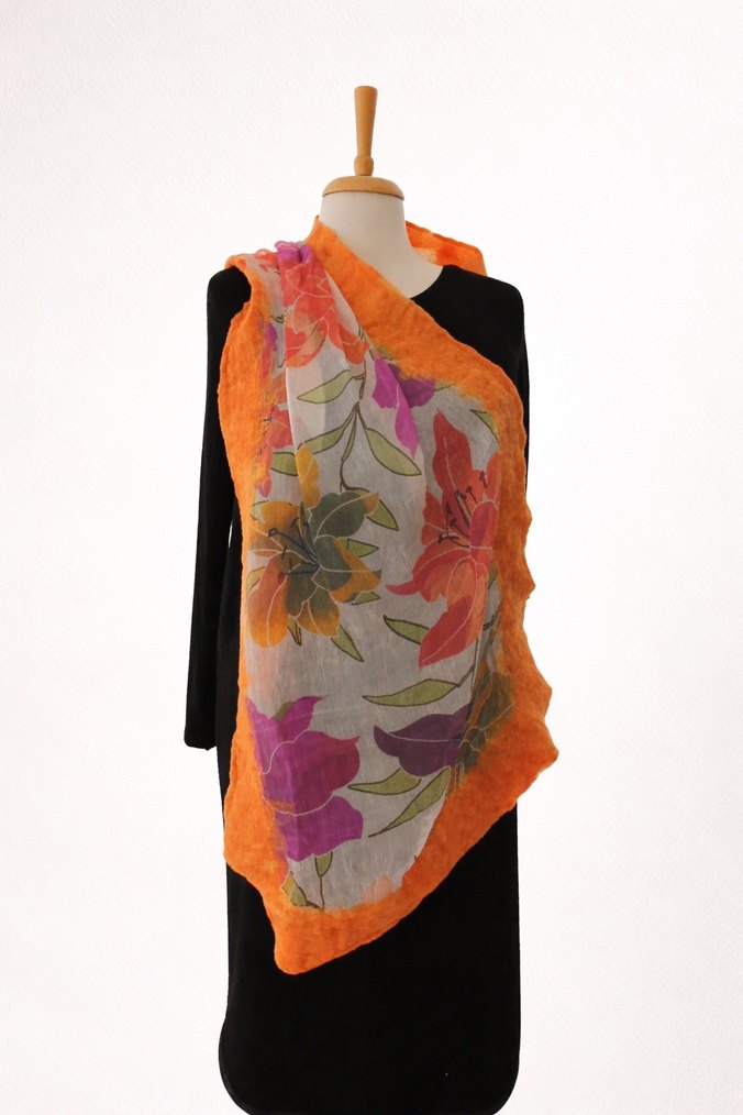 ıslak keçe ile yapılmış, ipek dokulu ve drapeli şal. Bohem tarzına uygun, moda ve avangart görünüme sahip.