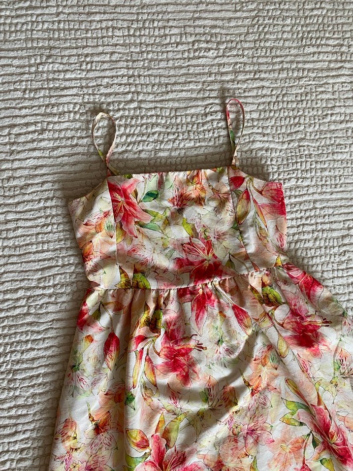Bu uzun, askılı elbise bol kesim ve drapeli tasarıma sahip, pastel çiçek desenli, bohem tarz ve düğünler için uygundur.HİÇBİR PROBLEMİ YOKTUR