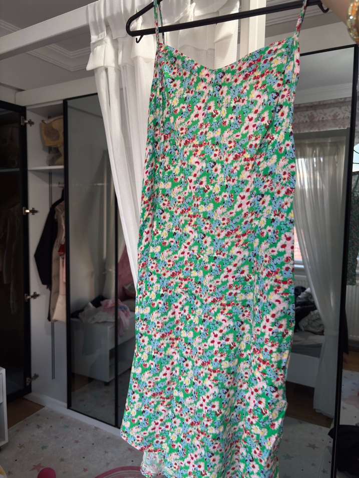 Çiçek desenli, uzun ve askısız bu elbise bol kesim ve drapeli yapıya sahiptir. Straplez yakasıyla bohem tarzı yansıtır.