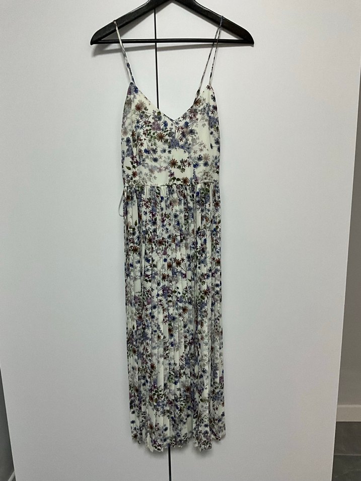 İnce askılı, straplez yakalı, bol kesim uzun elbise.Alt eteği piliseli kumaştan yapılmış, çok renkli çiçek desenli, günlük kullanım için uygun bohem tarzda. 38 ve 40 beden rahatlıkla giyebilir