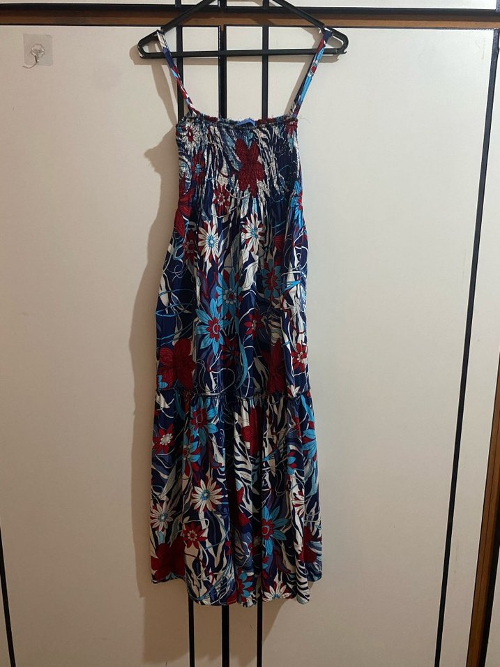 Çiçek desenli, askılı, straplez yaka, bol kesim, dökümlü tekstil kumaştan uzun bohem elbise. viskon kumaş pamuklu