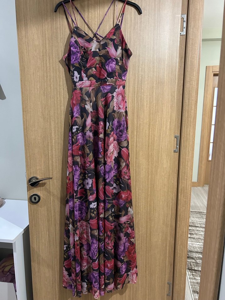 Uzun, askılı, straplez kesim bohem elbise, koyu renkli çoklu çiçek deseni ve drapeli detaylara sahip, romantik akşamlar için uygun. 1 kez giyilmiştir.