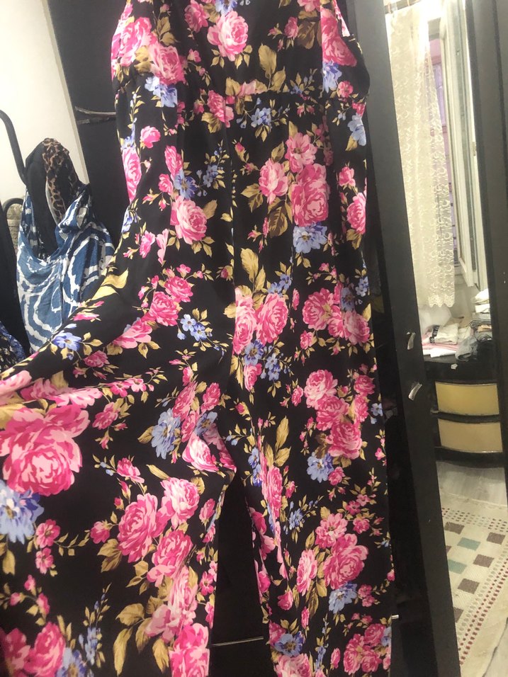 Uzun, askısız, bol kesim ve drapeli tasarıma sahip, koyu renkli sentetik kumafta canlı çiçek desenleri bulunan bohem tarz tulum.