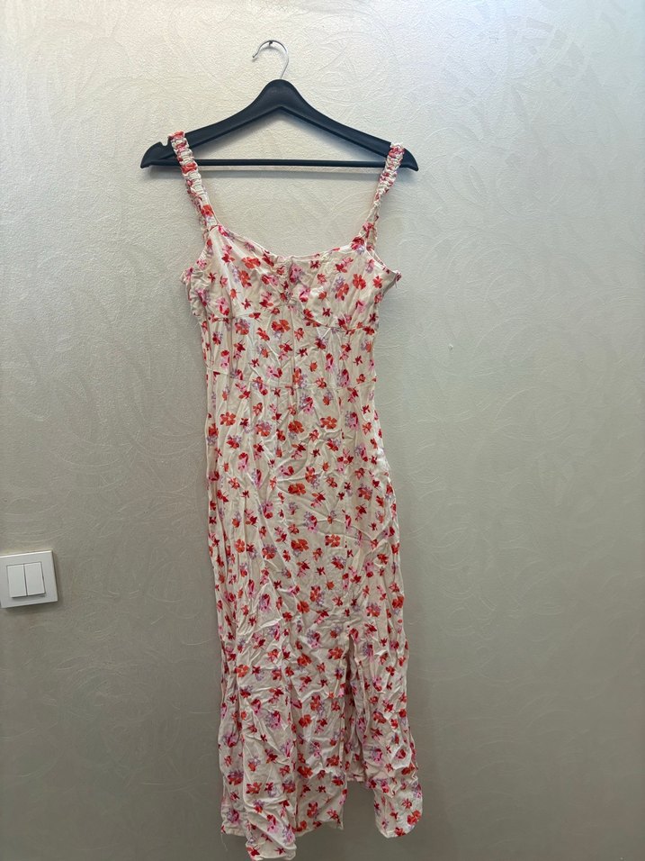 Uzun, askılı ve çiçek desenli bu elbise, hafif kumaştan olup drapeli ve straplez yakaya sahiptir. Bohem ve retro tarzını yansıtır.