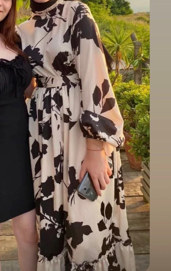 Bej renkli, uzun ve bol kesimli elbise, uzun kollu . Koyu çiçek desenli, dökümlü tasarıma sahip, saten kumaş.