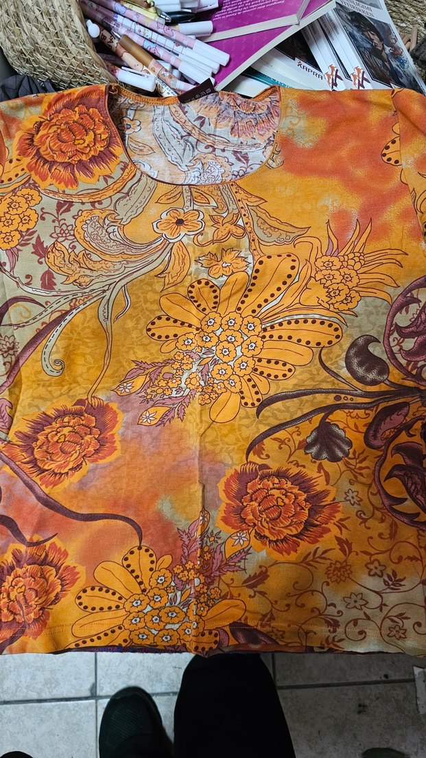 Tekne yaka ve kısa kollu bu bluz, yumuşak sentetik kumaştan yapılmıştır. Canlı koyu çok renkli çiçek desenleri ve drapeli detaylarıyla bohem tarzını yansıtır.