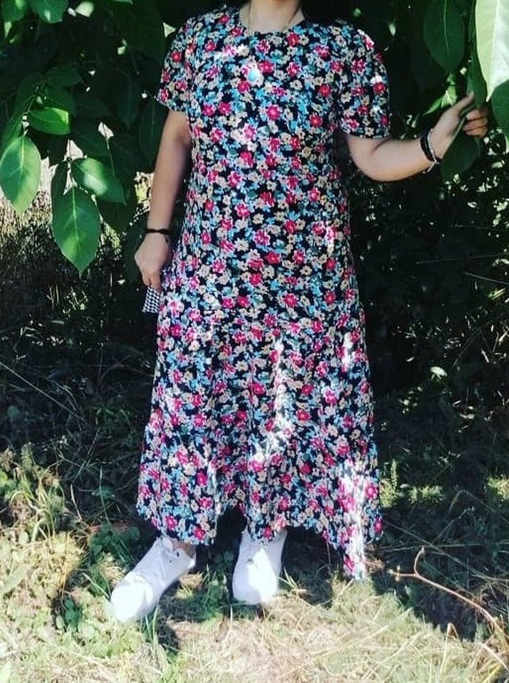 Bu uzun, bol kesim elbise koyu renkli çok renkli çiçek desenine, pilelere ve askılı kollara sahiptir. V yakalı ve bohem tarzda, günlük kullanım için uygundur.