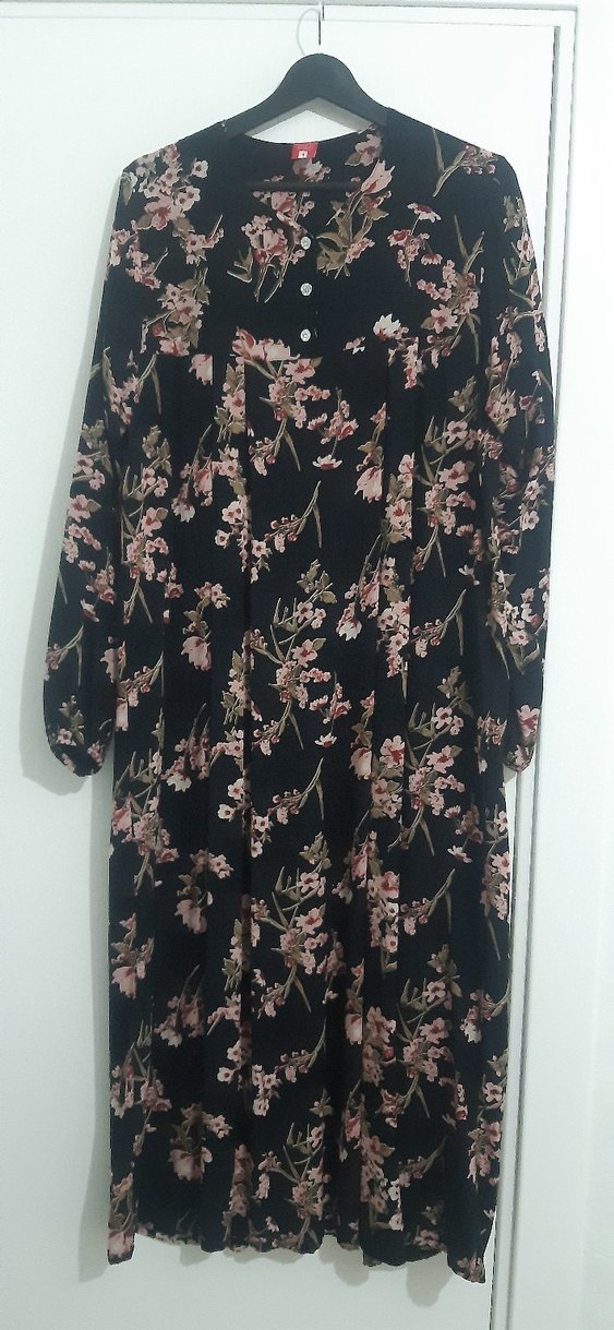 Uzun, bol kesim elbise, koyu renkli çiçek deseni, düğmeli ve uzun kollu. Yüksek yakalı, bohem tarzda, günlük kullanım için uygun.