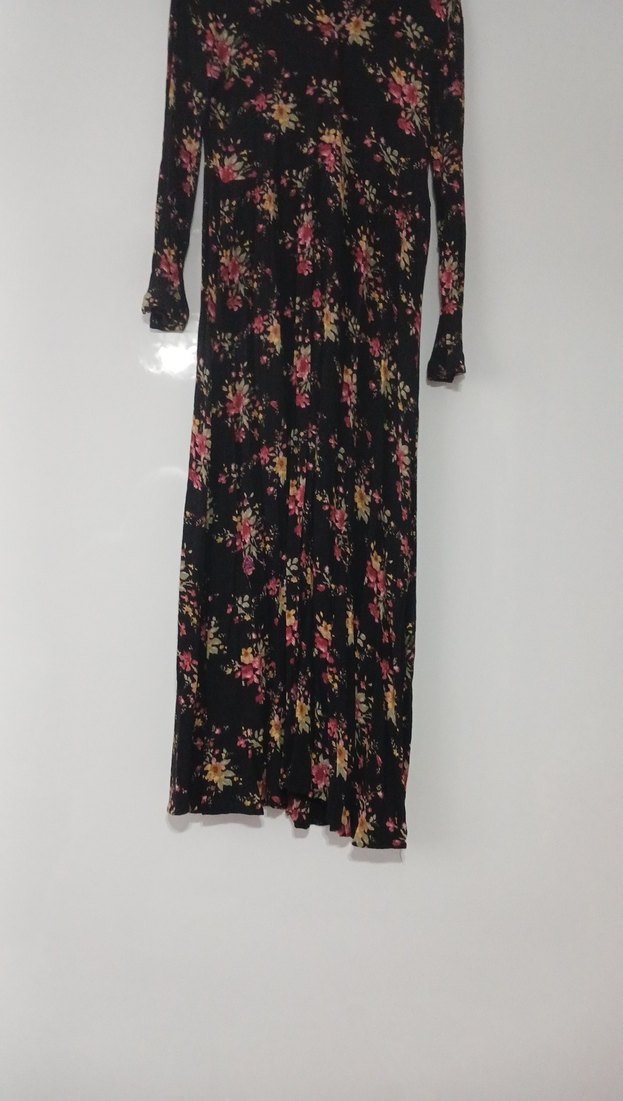 Uzun kollu, V yaka, pileli tasarıma sahip, koyu renk çiçek desenli, bol kesim sentetik kumaş elbise.