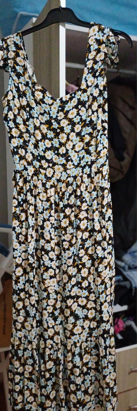 Çiçek desenli, askısız uzun bohem elbise, bol kesim ve koyu çok renkli. Sentetik kumaştan yapılmış ve drapeli tasarıma sahip.