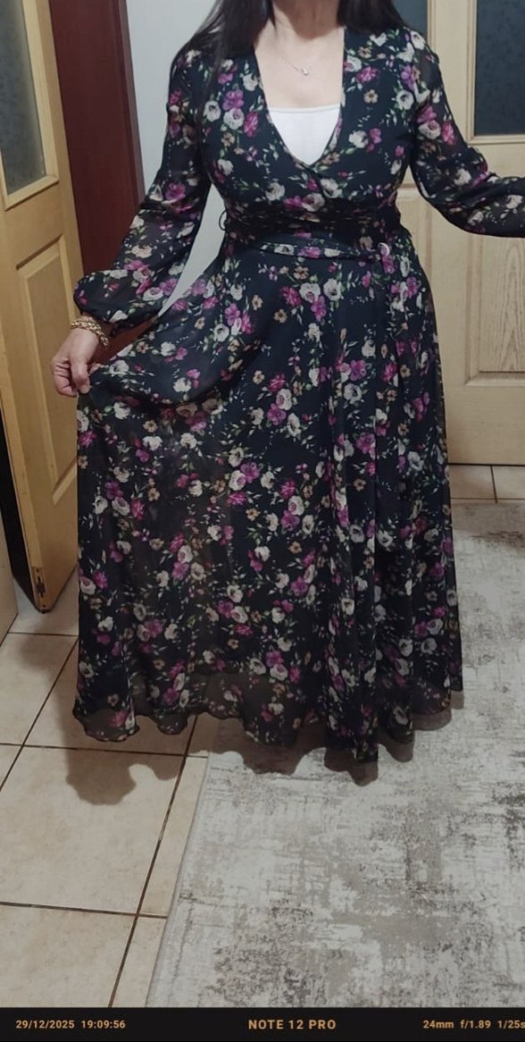 Uzun, koyu renkli çiçek desenli bohem elbise. V yaka ve askılı kollu, bol kesim ve dökümlü yapıya sahip. Romantik akşamlar için uygun.içi astarlıdır.