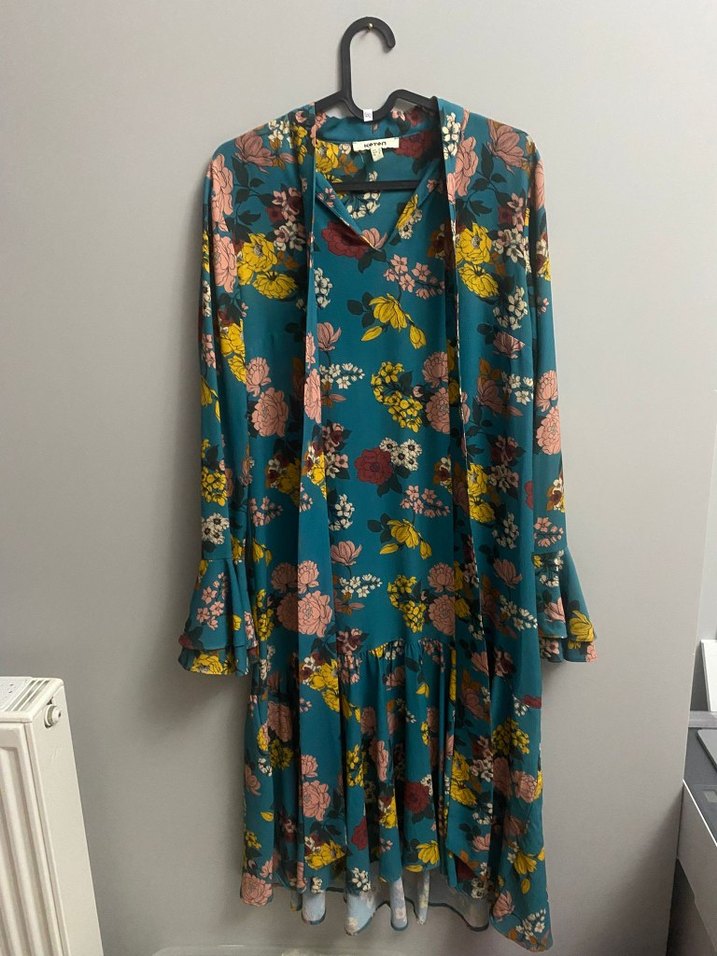 Bu uzun, bol kesim elbise koyu renkli çok renkli çiçek desenine, uzun kollara ve V yakaya sahiptir. Bohem tarzı için fırfır detayları bulunur, yumuşak sentetik kumaştandır.