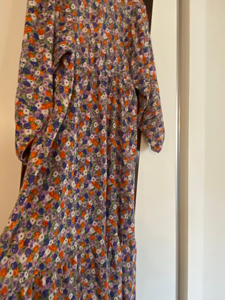 Çiçek desenli, düğmeli, V yaka ve uzun kollu rahat kesim bohem elbise, günlük kullanım için uygundur.