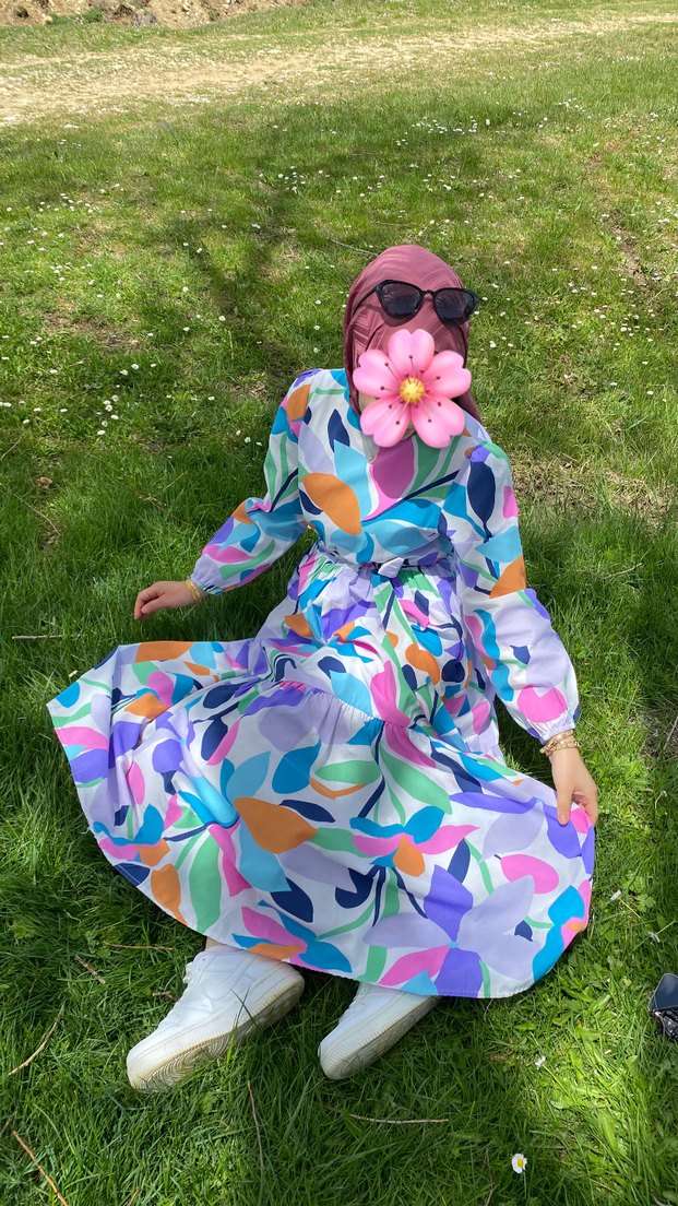 Pastel renklerde çiçek desenli, uzun ve bol kesim elbise. Yüksek yakalı, uzun kollu, drapeli bohem tarzda, yumuşak sentetik kumaştan yapılmıştır.