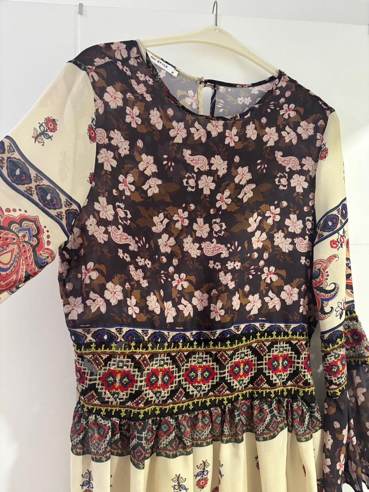 Koyu renkli çok renkli çiçek ve geometrik desenlere sahip uzun, bol kesim elbise. Yuvarlak yaka ve uzun kolludur, bel kısmında fırfır detayları bulunur.