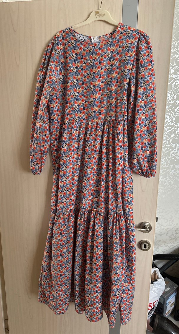 Uzun, bol kesim elbise pastel çok renkli çiçek desenli ve fırfır detaylıdır. Uzun kollu ve yuvarlak yakalı, bohem tarzına uygundur.