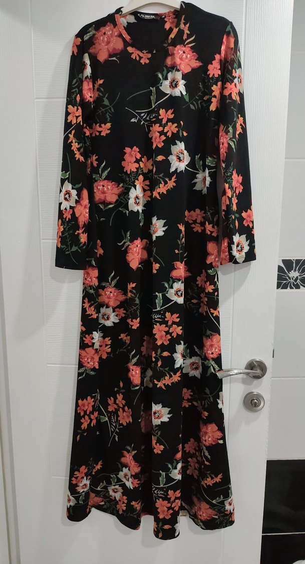 Uzun, bol kesim elbise koyu çiçek desenli, uzun kollu ve V yakalıdır. Önü düğmelidir ve sentetik yumuşak kumaştandır, bohem tarzındadır.