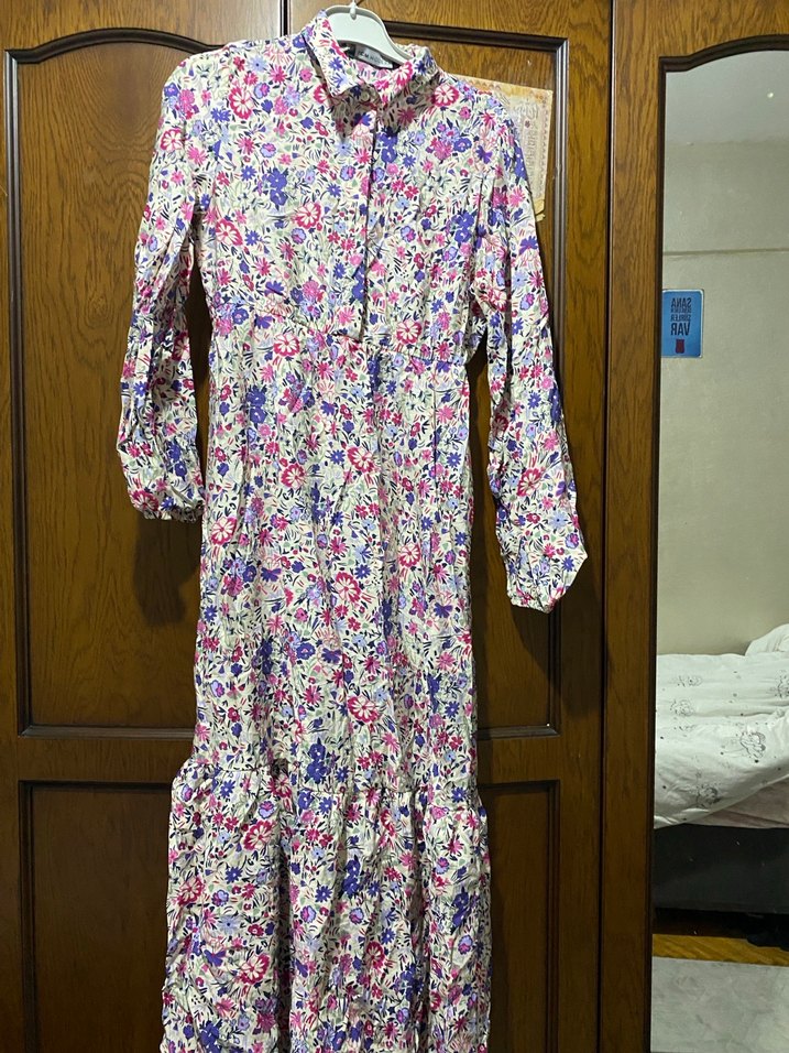Pastel çiçek desenli, uzun ve bol kesim elbise. Yaka ve düğmeli uzun kolludur, sentetik kumaştan yapılmıştır. Günlük kullanıma uygundur. Sadece bayramda 1 kere giyildi, onun dışında tertemizdir.