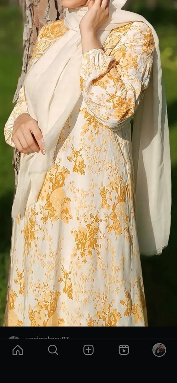 Uzun, bol kesim ve drapeli bu elbise, uzun kollu ve V yakalıdır. Sentetik kumaştan yapılmış, beyaz ve sarı çiçek desenlidir, düğünler için uygundur.