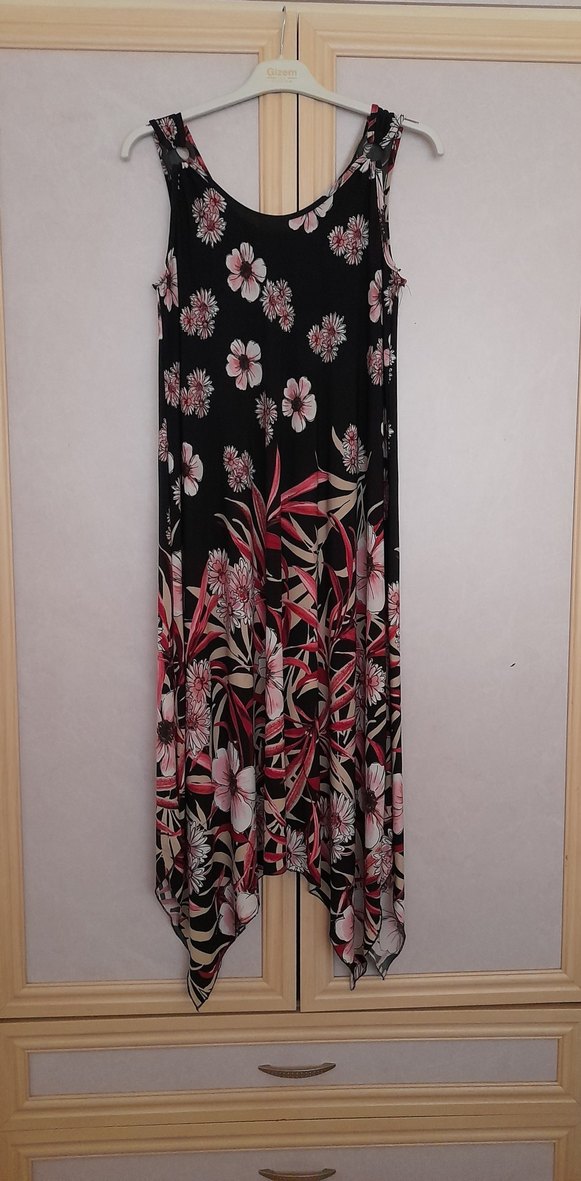 Çiçek desenli, askısız ve bol kesim uzun elbise. Drapeli tasarımıyla bohem tarzını yansıtır. Göğüs 55 Boy 120 ✨️