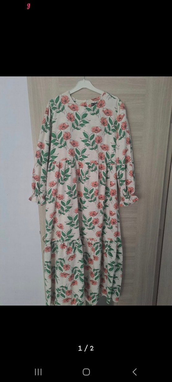 Beyaz uzun elbise, bol kesim, uzun kollu ve yuvarlak yaka. Yumuşak sentetik kumaştan, çiçek desenli ve fırfırlı, bohem tarzını yansıtıyor. 46 beden. 2 3 kez giyildi.