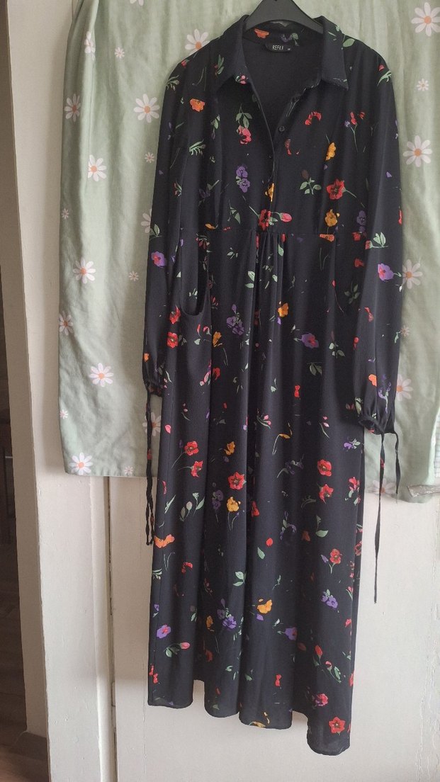 Çiçek desenli, uzun ve bol kesim elbise, uzun kollu ve straplez yakalı, yumuşak sentetik kumaştan yapılmıştır.