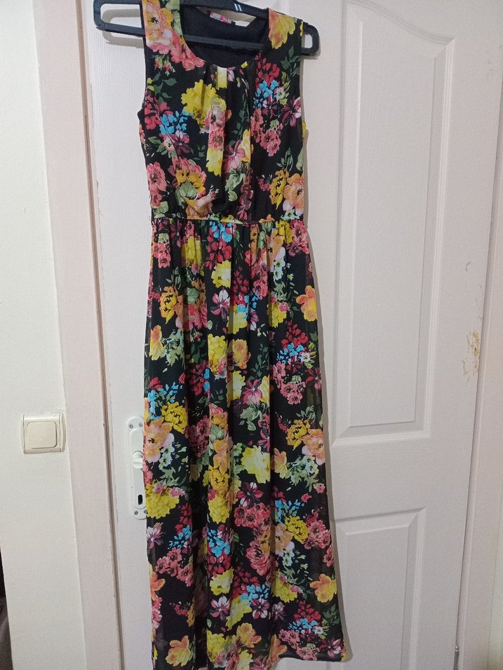 Kolsuz, kalın askılı uzun elbise, koyu renkli canlı çiçek desenli ve pileli detaylıdır. Sentetik kumaştan, bol kesim ve bohem tarzındadır. ölçüleri için yaziniz.