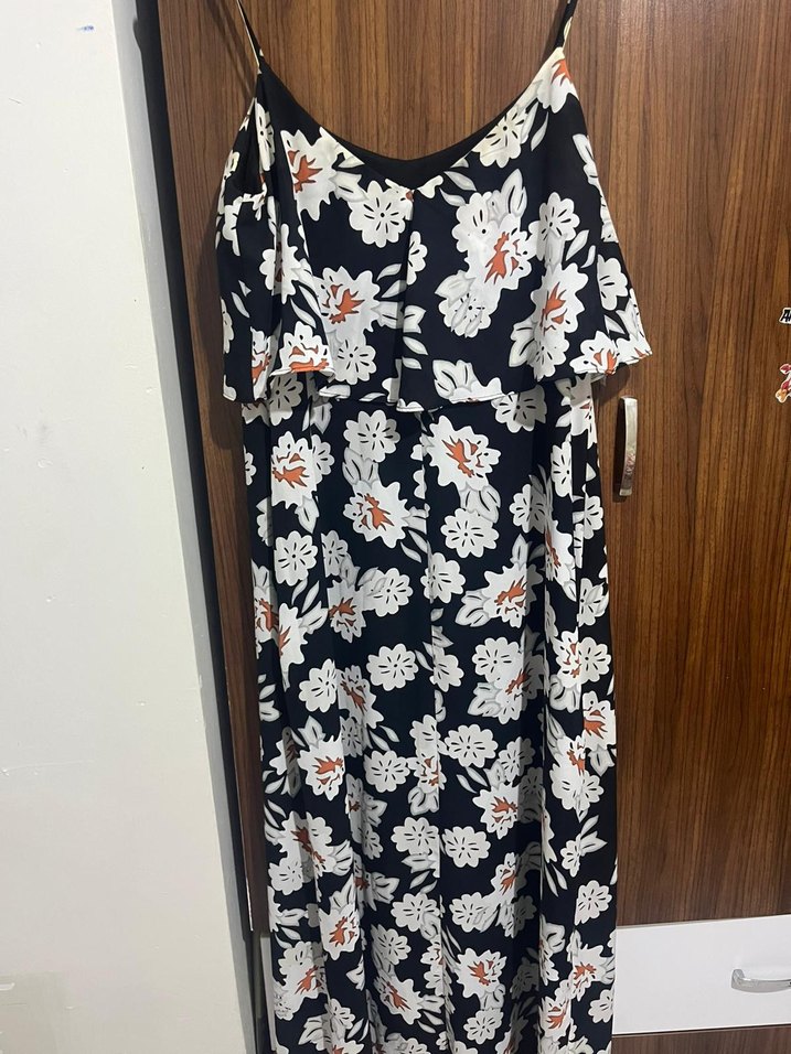 Askılı, kolsuz uzun elbise, bol kesim ve volan detaylıdır. koyu renk çok renkli çiçek desenli bohem tarzda bir elbisedir.