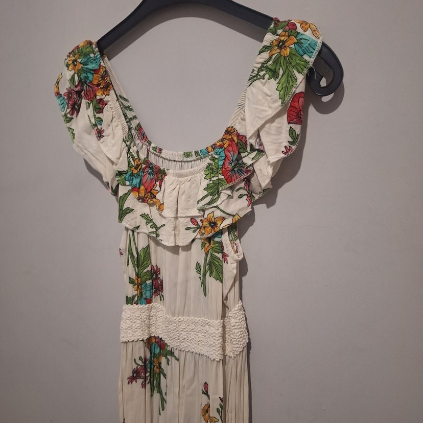 Çiçek desenli, uzun boy bohem elbise. Straplez yaka, fırfırlı ve ince askılı kollara sahiptir. S bedendir.