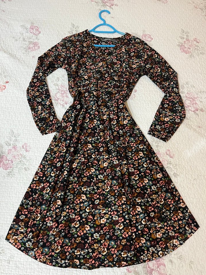 Bol kesim, uzun kollu bohem elbise, koyu renkli çok renkli çiçek desenli ve düğmeli V yakalı. Yumuşak sentetik kumaştan, günlük kullanım için uygun.